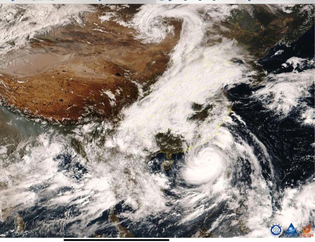 ▲今日10时“桦加沙”的卫星云图,其体积庞大,预计将以每小时20-25公里的速度向西偏北方向移动。中央气象台官网截图